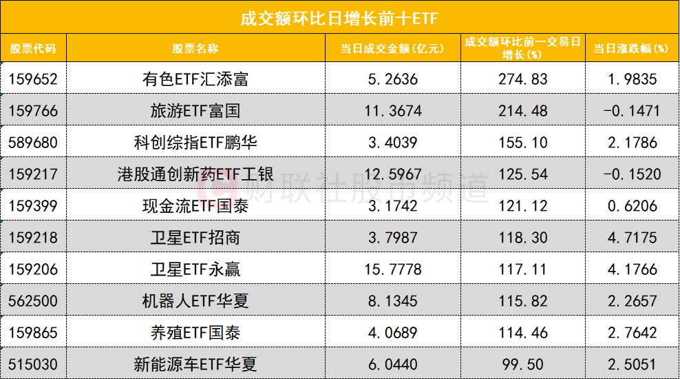 从成交额环比增长前十的ETF来看,有色ETF汇添富(159652)成交额环比增长274%位居首位;旅游ETF富国(159766)成交额环比增长214%位居次席。