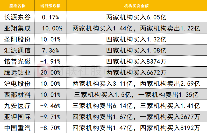 今日龙虎榜机构活跃度较高,储能概念股圣阳股份走出4连板,获四家机构买入1.32亿。算力硬件方向获机构青睐,其中汇源通信获四家机构买入1.08亿;铭普光磁获四家机构买入8374万;沪电股份获两家机构买入3.11亿,同时遭两家机构卖出2.59亿。长源东谷获两家机构大幅买入6.05亿。