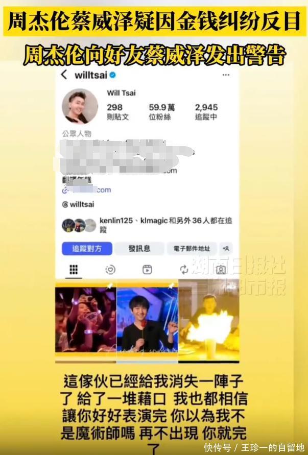 周杰伦发文称蔡威泽“这家伙已经消失一阵子了,找了一堆借口,我也都相信了,还让你好好完成表演” 。