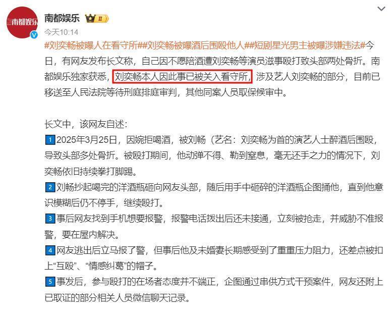 该网友说今年3月25日,因为婉拒喝酒,刘奕畅和其他几名演员就围殴他,导致他的头部多处骨折。