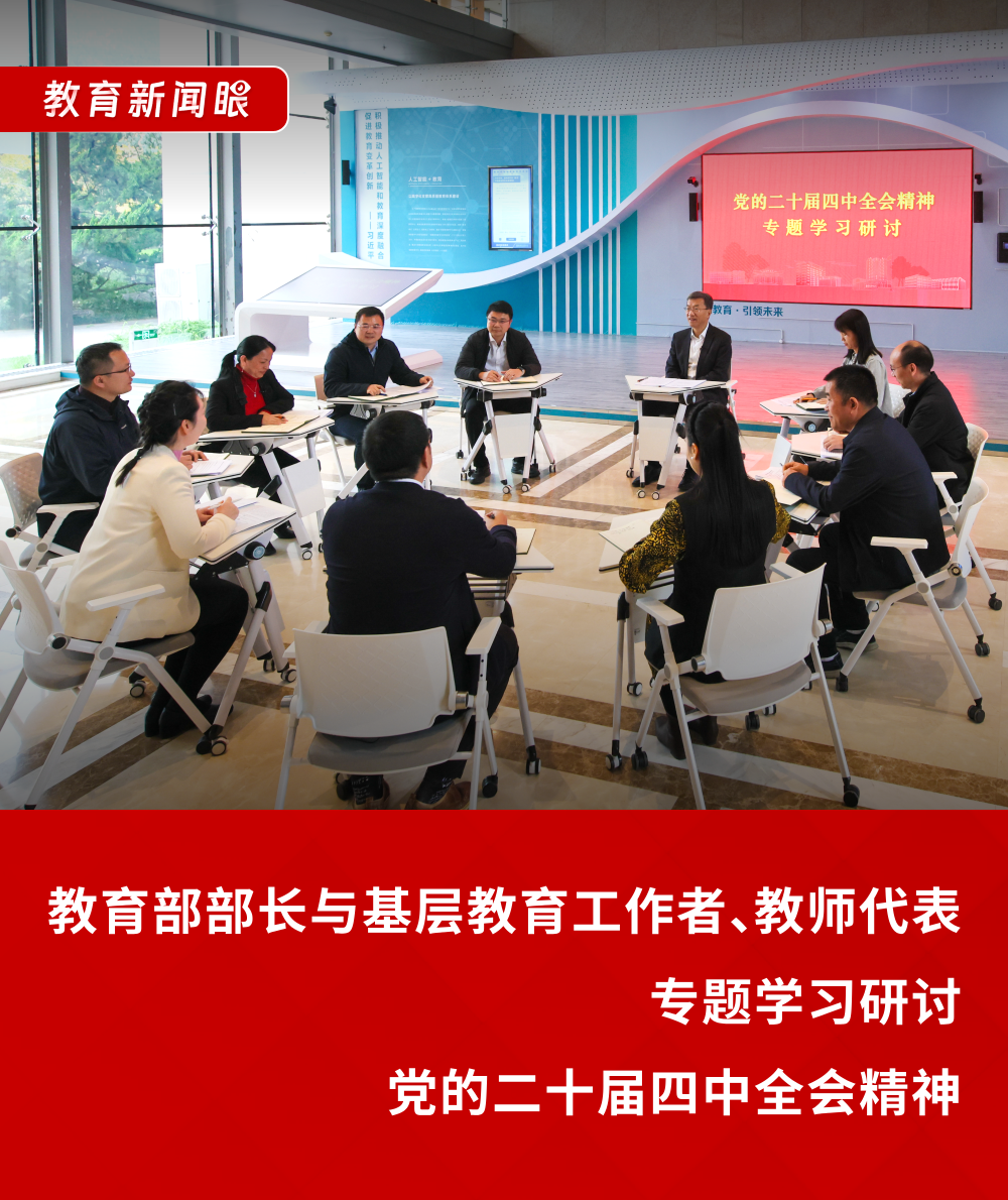 10月30日下午,国家教育行政学院,10名正在学院参训的教师和基层教育工作者组成学习小组,对党的二十届四中全会精神进行专题学习研讨。学习贯彻党的二十届四中全会精神中央宣讲团成员,教育部党组书记、部长怀进鹏参与了这场学习研讨。
